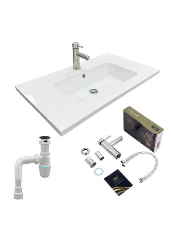 Набір для ванної кімнати Adamant FLATE 80 включає раковину зі штучного каменю, змішувач та сифон Click-Clack. Раковина прямокутної форми має розміри 80 х 45 х 14 см, білий колір та отвір для переливу, а вага становить 16,5 кг. Змішувач Kroner KRP Edelstahl Klassisch ESG010 оснащено аератором, металевим важелем та стаціонарним виливом довжиною 12 см з хромовим покриттям. Сифон Soloplast Тюльпан 0515 забезпечує мокрий гідрозатвор, автоматичне відкриття зливу та функцію переливу.