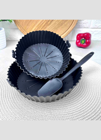 Силіконова форма для запікання з ручками, ідеальна для приготування страв в аерогрилях, аерофрітюрницях. Виготовлений із харчового силікону, який витримує високі температури та забезпечує рівномірне приготування страв. Форма має ребристі стінки, що дозволяє покращити циркуляцію повітря і робить страви хрумкішими. Діаметр дна форми – 15.5 см, діаметр вгорі – 19.5 см, висота – 4 см, із зручними ручками для безпечного вилучення з духовки. Колір-чорний Прекрасний вибір для запікання курки, овочів, десертів та інших страв.
