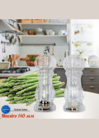 Вже двадцять лет ТМ Maestro користується попитом у покупців. Виробники усе час враховують потреби сучасного людини. Посуд Maestro функціональна і завжди відповідає естетичним вимогам споживача. Вона може стати прикрасою вашої кухні завдяки витонченості і красі. Набір для спецій Maestro — млин для перцю і сільничка — прекрасно доповнить щоденну і святкову сервіровку столу.Предмети виготовлені з кольорового глянцевого акрилу.Млин оснащена жорнами з міцної нержавіючої стали, є регулятор помелу — гвинт на верхньої частини млини.Сільничка наповнюється через отвір в нижній частини, яке закривається пробкою на різьбі.
