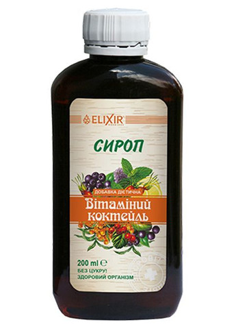 «Вітамінний коктейль» — це натуральний сироп на основі рослин, багатих на вітаміни та мінерали, які підтримують імунітет, зміцнюють організм і покращують загальне самопочуття. Дія та показання до застосування: Підтримка імунної системи; Забезпечення організму вітамінами А, С, Е, групи В, Р, К; Підтримка роботи серця, судин, зору та шкіри; Загальна зміцнювальна дія на організм; Сприяння нормальному обміну речовин завдяки багатому складу мікро- та макроелементів. Екстракт шипшини. Шипшина, плоди (Rosa canina L.) - дикорослий чагарник роду родини розових (Rosaceae). Плоди містять вітаміни: аскорбінова кислота (вітамін С) - до 14% на суху речовину, вітаміни В1, В2, ВЗ, PP, К; каротиноїди: а- і (3-каротини, лікопін, фітофлуїн, полі-цис- лікопіни А, В і С, криптоксантин, рубіксантин, тараксантин, макро- і мікроелементи: K, Са, Mg, Fe, Mn, Cu, P, Zn, J. Активні компоненти шипшини чинять легку проносну дію. Дубильні речовини, що містяться в ній, мають протизапальну та заспокійливу дію на шлунково-кишковий тракт. Також вони зміцнюють імунну систему. Екстракт плодів горобини чорноплідної. Аронія чорноплідна (Aronia melanocarpa (Michaux) Elliot) - багаторічна рослина. Основними діючими речовинами аронії є фенольні сполуки, терпеноїди і вуглеводи. У плодах виявлено 5-6% фенольних сполук та вітаміни: аскорбінова кислота - до 167 мг%, каротиноїди - 4,4-5,6 мг%, фолієва кислота, нікотинова кислота філохінон (вітамін К1), рибофлавін (вітамін В2), токофероли (вітамін Е); азотвмісні сполуки; макро- і мікроелементи: K, Са, Fe, Mg, P, F, Mn, Cu, Zn, Mo, Se, B, J. Плоди чинять гіпотензивні, спазмолітичні, протизапальні, антимікробні, капілярозміцнювальні, сечогінні та жовчогінні властивості, виявляють помітний активізуючий вплив на систему гемостазу. Екстракт обліпихи. Обліпиха, плоди або щець (Hippophae) - рід багаторічних рослин родини маслинкових. Плоди містять цукри, органічні кислоти, жирні олії, вітаміни А, групи В, С та каротини, дубильні та пектинові речовини. Обліпиха споживається при гіповітамінозах. Високий вміст вітамінів, олії та інших корисних речовин чинять бактерицидну дію, сприятливо впливають на стан шлунково - кишкового тракту. Рекомендації до споживання: може бути використана в раціонах дієтичного харчування як джерело комплексу біологічно активних речовин рослинного походження та вітаміну С з метою створення оптимальних дієтологічних умов для нормальної роботи імунної системи та захисту клітин від оксидативного стресу. Спосіб застосування: Дорослим і дітям від 3 років по 1-2 чайні ложки 2-3 рази на день під час їди. Тривалість вживання погоджувати з лікарем.