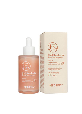 Сироватка для обличчя з комбучею, церамідами, гіалуроновою кислотою Medi-Peel Hyal Kombucha Tea-Tox Ampoule Medi-Peel Hyal Kombucha Tea-Tox Ampoule — це концентрована ампульна сироватка для відновлення зволоження та пружності шкіри обличчя. Серум з екстрактом чайного гриба допоможе вам зберегти шкіру молодою та здоровою. Він швидко прибирає сухість, пігментні плями, згладжує зморшки. Легка текстура сироватки швидко вбирається в шкіру. Вона некомендогення, тому підходить для всіх типів шкіри, включно з чутливою та жирною. Б'юті-засіб пришвидшує регенерацію шкіри та може використовуватися після пілінгів. Які проблеми розв'язує: сухість і зневоднення шкіри; зниження пружності, еластичності; дрібні зморшки; нерівний тон шкіри, пігментація; шорсткість шкіри. Як працюють активні компоненти серуму для обличчя: комбуча (70% екстракту) — потужний антиоксидант, допомагає боротися з вільними радикалами, що викликають ушкодження шкіри, покращує текстуру шкіри, підвищення її пружність і еластичність; гіалуронова кислота (8 різновидів) — глибоко зволожує шкіру, покращує її структуру та зовнішній вигляд, допомагає відновити природний захист дерми та зменшити появу зморщок та інших ознак старіння; кераміди (3 різновиди) — зменшують сухість і подразнення, допомагають зміцнити природний захисний бар'єр епідермісу; камелія та шкірка мандарина — містять вітаміни й антиоксиданти, які сприяють поліпшенню тону шкіри, дарують їй сяйво та здоров'я; ніацинамід і аденозин — підвищують пружність і еластичність шкіри, зменшують появу зморщок і плям, а також ознаки втоми та стресу. Ефект від застосування сироватки: зволожена та гладка шкіра; скорочення глибини зморщок; рівніший, гарний колір обличчя; менше подразнень і почервоніння. Як користуватися: Ретельно очистьте шкіру від макіяжу та забруднень. Кілька крапель сироватки нанесіть на шкіру обличчя, уникаючи зони навколо очей. Використовуйте зволожувальний серум вранці та ввечері. Після нанесення сироватки рекомендується нанести зволожувальний або сонцезахисний крем для захисту шкіри. Для протинабрякового ефекту зберігайте сироватку в холодильнику. Об'єм: 50 мл
