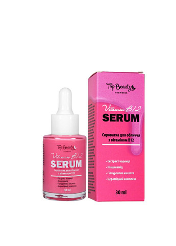"Рожева" сироватка для обличчя Top Beauty з вітаміном B12 для зволоження, відбілювання та живлення шкіри Сироватка Top Beauty Vitamin В12 зволожує, живить та захищає шкіри обличчя від шкідливих факторів. Потужна формула, розроблена українськими косметологами, включає: вітамін В12 – зберігає шкіру еластичною, зменшує сухість, прибирає лущення та запалення, покращує кровообіг; екстракт чорниці – освітлює пігментні плями, запобігає появі зморшок, насичує поживними елементами та вітамінами, підтримує пружність шкіри; ніацинамід – стимулює вироблення природного колагену шкіри, має протизапальні, регенеративні та антиоксидантні властивості; гіалуронова кислота – зволожує, розгладжує шкіру, активізує роботу клітин; кераміди (цераміди) - найважливіший структурний елемент ліпідного бар'єру, що допомагає відновлювати верхній шар при сухості та тріщинах, зволожують та пом'якшують шкіру при підвищеній чутливості. Спосіб застосування: Наберіть піпеткою трохи рожевої сироватки. Нанесіть на чисту шкіру. Розподіліть по обличчю. Дайте увібратися. Об'єм: 30 мл