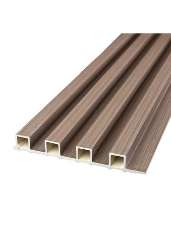 Стінові рейки WPC Опис: Стінові рейки WPC – будівельний матеріал для внутрішнього оздоблення, що імітує натуральну деревину. Фактура: гладка, імітація дерев'яної рейки Рейки складаються з наступних шарів: Полімерний шар, що захищає від потертостей та дрібних механічних пошкоджень, забезпечує довговічність використання, а УФ захист допомагає запобігти вигоранню, зберігаючи колір декоративного шару насиченим, за рахунок чого рейка довго має свій первісний естетичний вигляд. Декоративний шар: плівка з кольоровим друком високої роздільної здатності, яка повністю імітує фактуру природних матеріалів, завдяки чіткому та деталізованому зображенню. Основний шар WPC: є композитним матеріалом, який поєднує в собі деревні волокна (або стружку) з полімерними матеріалами, що забезпечує матеріалу міцність, стійкість до вологи і стійкість до впливу зовнішнього середовища. Температурний режим: від -50 º до +80 º С Застосування: внутрішні оздоблювальні роботи: декорування стін у всіх видах житлових приміщень (кухня, вітальня, дитяча або спальня, вхідна група) та комерційних приміщень (офісні приміщення, зони рецепцій, магазини, салони краси або фітнес-центри), декорування меблів, дверей та інших рівних поверхонь. Властивості та переваги матеріалу: Стійкість до вологи: матеріал WPC має високу стійкість до впливу вологи, не набухає і не деформується. Стійкість до гниття та комах: на відміну від деревини, WPC не схильний до гниття і не приваблює комах. Стійкість до впливу ультрафіолету: стінові панелі WPC зберігають свій колір та структуру під впливом ультрафіолетового випромінювання. Привабливий зовнішній вигляд: декоративний шар імітує натуральне дерево, що дозволяє створювати стильні та естетичні інтер'єри, знижуючи при цьому використання чистої деревини. Простота обслуговування: стінові панелі WPC зазвичай не потребують складного догляду. Вони не вимагають фарбування, обробки антисептиками та формальдегідами, зберігають свій зовнішній вигляд протягом тривалого часу. Розрахунок потрібної кількості матеріалу: Виміряйте довжину і висоту поверхні, що обклеюється. Помножте довжину на висоту кожної поверхні в метрах і складіть отримані результати, щоб отримати площу. Наприклад, після вимірів ви отримали:Довжина стіни 3,2м.Висота стіни 2,7м.3,2 * 2,7 = 8,64 м ² Площа, що вийшла, необхідно розділити на площу однієї рейки (160*3000= 0,48 м²) і округлити у більшу сторону: 8,64 / 0,48 = 18 округляємо до 18.У процесі монтажу можуть виникнути відходи, пов'язані з різанням рейок, тому рекомендується додати до розрахунку запасні 1-2 шт. Інструкція з монтажу: Підготуйте поверхню, на яку кріпляться рейки. Їх можна встановлювати на оштукатурені стіни, гіпсокартонні плити та дерев'яні матеріали. Якщо стіна обклеєна шпалерами, рекомендуємо їх зняти. Для різання рейки використовуйте циркулярну пилку або лобзик. Прикріпити рейку до потрібної поверхні можна за допомогою монтажного клею, бажано на поліуретановій або силіконовій основі. Користуючись інструкцією нанести клей на задню частину рейки, після чого встановити на потрібну поверхню. Рейки можна збирати вертикально чи горизонтально. Крім монтажного клею можна використовувати будівельний степлер, щоб закріпити їх на стіні. Прикріплювати скоби необхідно до краю паза рейки, щоб вони не були видно. Необхідні для монтажу матеріали: рі