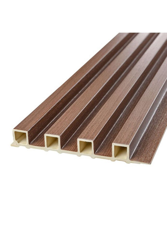 Стінові рейки WPC Опис: Стінові рейки WPC – будівельний матеріал для внутрішнього оздоблення, що імітує натуральну деревину. Фактура: гладка, імітація дерев'яної рейки Рейки складаються з наступних шарів: Полімерний шар, що захищає від потертостей та дрібних механічних пошкоджень, забезпечує довговічність використання, а УФ захист допомагає запобігти вигоранню, зберігаючи колір декоративного шару насиченим, за рахунок чого рейка довго має свій первісний естетичний вигляд. Декоративний шар: плівка з кольоровим друком високої роздільної здатності, яка повністю імітує фактуру природних матеріалів, завдяки чіткому та деталізованому зображенню. Основний шар WPC: є композитним матеріалом, який поєднує в собі деревні волокна (або стружку) з полімерними матеріалами, що забезпечує матеріалу міцність, стійкість до вологи і стійкість до впливу зовнішнього середовища. Температурний режим: від -50 º до +80 º С Застосування: внутрішні оздоблювальні роботи: декорування стін у всіх видах житлових приміщень (кухня, вітальня, дитяча або спальня, вхідна група) та комерційних приміщень (офісні приміщення, зони рецепцій, магазини, салони краси або фітнес-центри), декорування меблів, дверей та інших рівних поверхонь. Властивості та переваги матеріалу: Стійкість до вологи: матеріал WPC має високу стійкість до впливу вологи, не набухає і не деформується. Стійкість до гниття та комах: на відміну від деревини, WPC не схильний до гниття і не приваблює комах. Стійкість до впливу ультрафіолету: стінові панелі WPC зберігають свій колір та структуру під впливом ультрафіолетового випромінювання. Привабливий зовнішній вигляд: декоративний шар імітує натуральне дерево, що дозволяє створювати стильні та естетичні інтер'єри, знижуючи при цьому використання чистої деревини. Простота обслуговування: стінові панелі WPC зазвичай не потребують складного догляду. Вони не вимагають фарбування, обробки антисептиками та формальдегідами, зберігають свій зовнішній вигляд протягом тривалого часу. Розрахунок потрібної кількості матеріалу: Виміряйте довжину і висоту поверхні, що обклеюється. Помножте довжину на висоту кожної поверхні в метрах і складіть отримані результати, щоб отримати площу. Наприклад, після вимірювань ви отримали: Довжина стіни 3,2 м. Висота стіни 2,7 м. Площа, що вийшла, необхідно розділити на площу однієї рейки (150 * 3000 = 0,45 м ²) і округлити у велику сторону: 8,64 / 0,45 = 19,2 округляємо до 20. Інструкція з монтажу: Підготуйте поверхню, на яку кріпляться рейки. Їх можна встановлювати на оштукатурені стіни, гіпсокартонні плити та дерев'яні матеріали. Якщо стіна обклеєна шпалерами, рекомендуємо їх зняти. Для порізки рейки використовуйте циркулярну пилку або лобзик. Прикріпити рейку до потрібної поверхні можна за допомогою монтажного клею, бажано на поліуретановій або силіконовій основі. Користуючись інструкцією нанести клей на задню частину рейки, після чого встановити на потрібну поверхню. Рейки можна збирати вертикально чи горизонтально. Крім монтажного клею можна використовувати будівельний степлер, щоб закріпити їх на стіні. Прикріплювати скоби необхідно до краю паза рейки, щоб вони не були видно. Необхідні для монтажу матеріали: рівень лінійка циркулярна пилка/лобзик/болгарка клей на силіконовій/поліуретановій основі олівець. Рекомендації щодо догляду: Неба