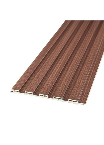 Стінові рейки WPC Опис: Стінові рейки WPC – будівельний матеріал для внутрішнього оздоблення, що імітує натуральну деревину. Фактура: гладка, імітація дерев'яної рейки Рейки складаються з наступних шарів: Полімерний шар, що захищає від потертостей та дрібних механічних пошкоджень, забезпечує довговічність використання, а УФ захист допомагає запобігти вигоранню, зберігаючи колір декоративного шару насиченим, за рахунок чого рейка довго має свій первісний естетичний вигляд. Декоративний шар: плівка з кольоровим друком високої роздільної здатності, яка повністю імітує фактуру природних матеріалів, завдяки чіткому та деталізованому зображенню. Основний шар WPC: є композитним матеріалом, який поєднує в собі деревні волокна (або стружку) з полімерними матеріалами, що забезпечує матеріалу міцність, стійкість до вологи і стійкість до впливу зовнішнього середовища. Температурний режим: від -50 º до +80 º С Застосування: внутрішні оздоблювальні роботи: декорування стін у всіх видах житлових приміщень (кухня, вітальня, дитяча або спальня, вхідна група) та комерційних приміщень (офісні приміщення, зони рецепцій, магазини, салони краси або фітнес-центри), декорування меблів, дверей та інших рівних поверхонь. Властивості та переваги матеріалу: Стійкість до вологи: матеріал WPC має високу стійкість до впливу вологи, не набухає і не деформується. Стійкість до гниття та комах: на відміну від деревини, WPC не схильний до гниття і не приваблює комах. Стійкість до впливу ультрафіолету: стінові панелі WPC зберігають свій колір та структуру під впливом ультрафіолетового випромінювання. Привабливий зовнішній вигляд: декоративний шар імітує натуральне дерево, що дозволяє створювати стильні та естетичні інтер'єри, знижуючи при цьому використання чистої деревини. Простота обслуговування: стінові панелі WPC зазвичай не потребують складного догляду. Вони не вимагають фарбування, обробки антисептиками та формальдегідами, зберігають свій зовнішній вигляд протягом тривалого часу. Розрахунок потрібної кількості матеріалу: Виміряйте довжину і висоту поверхні, що обклеюється. Помножте довжину на висоту кожної поверхні в метрах і складіть отримані результати, щоб отримати площу. Наприклад, після вимірювань ви отримали: Довжина стіни 3,2 м. Висота стіни 2,7 м. Площа, що вийшла, необхідно розділити на площу однієї рейки (160 * 3000 = 0,48 м ²) і округлити у велику сторону: 8,64 / 0,48 = 18 округляємо до 18. Інструкція з монтажу: Підготуйте поверхню, на яку кріпляться рейки. Їх можна встановлювати на оштукатурені стіни, гіпсокартонні плити та дерев'яні матеріали. Якщо стіна обклеєна шпалерами, рекомендуємо їх зняти. Для порізки рейки використовуйте циркулярну пилку або лобзик. Прикріпити рейку до потрібної поверхні можна за допомогою монтажного клею, бажано на поліуретановій або силіконовій основі. Користуючись інструкцією нанести клей на задню частину рейки, після чого встановити на потрібну поверхню. Рейки можна збирати вертикально чи горизонтально. Крім монтажного клею можна використовувати будівельний степлер, щоб закріпити їх на стіні. Прикріплювати скоби необхідно до краю паза рейки, щоб вони не були видно. Необхідні для монтажу матеріали: рівень лінійка циркулярна пилка/лобзик/болгарка клей на силіконовій/поліуретановій основі олівець. Рекомендації щодо догляду: Небаж