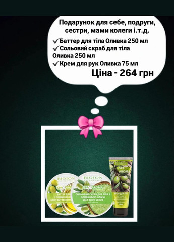 До складу набору входить: Баттер для тіла Оливка 250 мл Солоьовий скраб для тіла Оливка 250 мл Крем для рук Оливка 75 мл