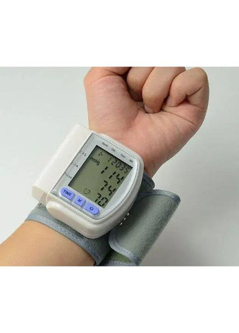 Автоматичний тонометр для вимірювання тиску пульсу на зап'ястя Blood Pressure Monitor CK-102S Тонометр — необхідний медичний прилад. Не варто думати, що періодичний вимір тиску приділ літніх і гіпертоніків, молодим людям теж важливо знати свій тиск і причину нездужання. Будинки у нас звичайний автоматичний плечовий тонометр, зап'ястний тонометр компактний, і тому його можна взяти з собою в дорогу або покласти в ящик столу на роботі. Якісний електронний тонометр (сфігмоманометр) для швидкого вимірювання кров'яного тиску та пульсу. Автоматичний тонометр – це сучасна система, що керує виміром пульсу та тиску. Тепер Вам не потрібно докладати багато зусиль, використовуючи незручні та громіздкі ручні прилади! Пропонований автотонометр одягається на зап'ястя. Оснащений великим дисплеєм, на якому відображаються час вимірювання, пульс і тиск. Цей прилад оснащений інтелектуальною системою IQ System і індикатором аритмії. Завдяки вбудованій пам'яті автоматичний тонометр на зап'ясті здатний запам'ятовувати останні 90 значень. Прилад має спеціально розроблену унікальну манжету, яка гарантує надійне зчитування пульсу та високу точність вимірювань Тонометр дуже зручний, якщо потрібно взяти з собою в дорогу, у відпустку, у відрядження - не займає багато місця і завжди під рукою. За допомогою такого приладу зручно вимірювати артеріальний тиск лежачому хворому, який потребує спокою або з обмеженими руховими здібностями. виміряє Ваш артеріальний тиск. Тримайте під контролем своє здоров'я, завдяки компактному приладу для вимірювання артеріального тиску. Автоматичний тонометр на зап'ясті CK-102S компактний і простий в управлінні. і пульсу. ХАРАКТЕРИСТИКИ - Діапазон вимірювання тиску, 0 - 280 мм рт.ст. - Діапазон вимірювання серцевого ритму, 40 - 199 уд/хв - Точність вимірювання: тиск ± 3 мм рт. ст., серцевий ритм ± 5% - 90 осередків пам'яті для запам'ятовування результатів вимірів. - Рекомендована довжина кола зап'ястя від 135 до 195 мм - Великий контрастний цифровий РК-екран - Працює від 2 * AAA батарей (не входить до комплекту), кількість вимірів від одного комплекту батарей - не менше 250. - Автоматичне відключення для економії електроенергії та енергії. - Вага: 140 г. СПОСІБ ЗАСТОСУВАННЯ: Вставте батарейки в контейнер. Зніміть усі прикраси та закатайте рукав. Покладіть лівий лікоть на стіл, долоня руки повинна дивитися вгору. Наденьте манжету тонометра на зап'ястя, між тонометром і долонею повинна бути відстань 1 см. Затягніть манжету тугіше, щоб між пов'язкою та Вашим зап'ястям не було вільного простору. Увімкніть пристрій та зробіть необхідні вимірювання.