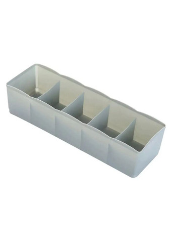 Опис Акуратно скласти, звільнити простір і навести лад у шафі допоможе органайзер для спідньої білизни та шкарпеток 5 відділень. Візьміть кілька таких органайзерів і розмістіть їх у ящику комода або на полиці. Тепер ваші особисті речі не мнуться й зберігаються в одному місці. Легкий і компактний Виготовлений із легкого та міцного пластику. Має п'ять відділень однакового розміру. Матеріал стійкий до пошкоджень і легко миється. Має відкриту конструкцію, завдяки чому ви відразу знайдете потрібну вам річ, і вам не доведеться перевертати весь вміст полиці. Візьміть у дорогу Органайзер стане в пригоді й тим, хто часто подорожує або їздить у відрядження. Тепер не треба думати, куди і як розмістити білизну та шкарпетки для поїздки. просто відкрийте комод, візьміть з нього органайзер разом із речами та покладіть у валізу. Варіанти використання Прекрасно підійде для зберігання різних побутових і господарських дрібниць. Ви можете розмістити в відділеннях органайзера аксесуари для шиття та рукоділля, прикраси для волосся, біжутерію, декоративні елементи для творчості та навіть кріплення. Характеристики: Матеріал: пластик; Розміри: 26х8х5,5 см; Ширина 1 відділення: 5 см; Колір: сірий; Вага: 60 г.