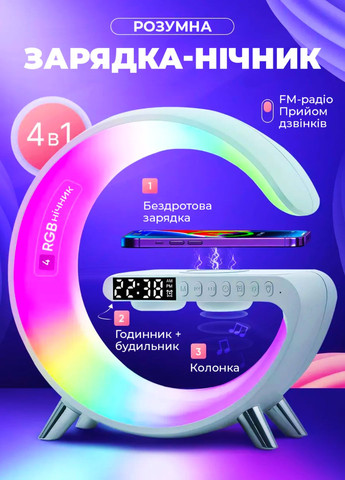 Нічний смарт XM-G3 RGB підсвічування Bluetooth з колонкою бездротовою зарядкою годинником будильником радіо Смарт нічник-світильник XM-G3 – це сучасний пристрій для будинку, який освітлює кімнату, працює як нічник, годинник, будильник, відтворює музику з телефону, а також має бездротову зарядку та стильний дизайн. Лампа оснащена регульованою яскравістю світла, а також додатковими функціями, такими як можливість зміни кольорової гами освітлення. Багатофункціональний пристрій допоможе вам розслабитися після довгого дня, увімкнувши спокійну музику та необхідне освітлення для вашого настрою. Динаміки відтворюють об'ємний звук, ви можете слухати улюблену музику з ваших смартфонів і карти пам'яті, ну або радіо. Підключення здійснюється між пристроями через Bluetooth. Завдяки вбудованій бездротовій зарядці, ви можете зручно та швидко заряджати свої смартфони або інші пристрої, просто розмістивши їх на поверхні лампи. Це особливо зручно вночі або на робочому столі, коли вам необхідно підтримувати пристрої зарядженими у зручному місці. У лампі вбудована бездротова зарядка потужністю 15Вт. Користуватися зарядним пристроєм дуже комфортно завдяки сучасному та компактному дизайну пристрою. Функція швидкого заряджання дозволяє за короткий проміжок часу відновлювати заряд акумулятора на телефоні. Функціональні особливості: Bluetooth, Годинник, Будильник, USB, TF, AUX, TWS, FM, Колірні теми, що реагують на музику, бездротова зарядка для всіх типів телефонів з бездротовим обладнанням QI; Характеристики XM-G3: Матеріал: ABS+PC Потужність: 15Вт Час відтворення: 3-5 год Час зарядки: 2-3 год Дальність передачі: 10 м Bluetooth 5.3 Діапазон частот звуку 50 Гц-20кГц Розмір продукту: 23,5 x 22 x 8 см Яскравість: 2800 - 6500К Додаток: HappyLighting Комплектація: Смарт лампа Кабель для заряджання Заводська упаковка Інструкція