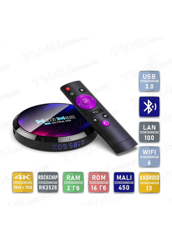 Призначення пристрою ТВ приставка H96 Max RK3518 перетворює будь-який телевізор у повноцінний Smart TV із доступом до інтернету, додатків, IPTV, YouTube, ігор та медіа. Можливості Перегляд фільмів та серіалів онлайн у високій якості (до 4K) Онлайн ТБ: IPTV, YouTV, SWEET.TV, Київстар ТБ, Megogo тощо Мультимедійний центр для дому: Youtube, Spotify тощо Ігри з підтримкою геймпадів на великому екрані Перегляд файлів із зовнішніх накопичувачів Загальні характеристики Смарт ТВ приставка H96 Max RK3518 працює на процесорі Rockchip RK3518, який має 4 ядра ARM Cortex-A53, та оснащений графічним прискорювачем ARM Mali-450. Має 2 Гб оперативної пам’яті та 16 Гб внутрішньої пам’яті. Операційна система та додатки H96 Max RK3518 2/16 Гб працює на ОС Android TV 14 , яка розроблена спеціально для телевізорів та медіаприставок. Операційна система має більш простий інтерфейс та повністю адаптована під роботу з пультами. Переваги перед звичайним Android: великі іконки, рекомендації з YouTube та онлайн кінотеатрів на головному екрані, інтегроване голосове управління. На пристрої встановлено ATV Google Play Маркет, який дозволяє встановлювати програми лише ті, які повністю адаптовані до цієї ОС. Всі інші програми можна встановити вручну із APK-файлу або за допомогою альтернативних маркетів. Наявність сертифікацій Google Widevine DRM L3 Методи підключення до телевізора HDMI — такий вхід на телевізорах почав з'являтися з 2004 року (рекомендуємо перевірити наявність). AV — через "тюльпані" до старих моделей телевізорів без порту HDMI, потрібно лише докупити кабель-перехідник з mini-jack 3.5 mm на 3xRCA. Підтримка кодеків - H.265/HEVC Main/Main10 profile level 5.1 High-tier 4Kx2K 60fps - MPEG-1, Main profile 1080P 60fps - MPEG-2, SP ML, MP HL 1080P 60fps - MPEG-4, ASP profile level 5 1080P 60fps - AVS, Jizhun profile level 6.0 1080P 60fps - AVS-P16 (AVS+), up to 1080P 60fps - H.263, up to 576P 60fps - VC-1, SP ML, MP HL, AP L0-3, up to 1080P 60fps Інтернет-з’єднання і бездротовий зв'язок ТВ приставка H96 Max RK3518 2/16 Гб підтримує підключення до інтернету через Wi-Fi 2.4 ГГц + 5 ГГц + 6 ГГц (стандарт бездротової мережі Wi-Fi IEEE 802.11 a/b/g/n/ac/ax). Також ТВ приставку можна підключити до мережі інтернет через LAN (локальну мережу) за допомогою кабелю (вита пара з конектором RJ-45). Пристрій підтримує підключення по LAN від 10 до 100 Мбіт/с На відміну від телефонів і планшетів, прийом WiFi у всіх ТВ приставок слабкіше, тому якщо роутер перебуває за перешкодами (стіни, двері тощо), рекомендується підключати ТВ бокс через LAN кабель. Рекомендована швидкість інтернету необхідна для роботи пристрою: Youtube і IPTV 720p HD ready від 5 Мбіт/с Youtube і IPTV 1080p Full HD від 10 Мбіт/с Youtube і IPTV 4К від 40 Мбіт/с Торренти 1080p Full HD від 50 Мбіт/с Торренти 4К від 100 Мбіт/с Пристрій має Bluetooth 5.4, який може використовуватись для підключення зовнішніх пристроїв таких як бездротові колонки, навушники, пульт, геймпад, тощо. Інтерфейси USB 2.0 - 1 шт, для підключення флешки, мишки, клавіатури, геймпаду та інших USB пристроїв. Має стандартну швидкість передачи даних. USB 3.0 - 1 шт,для підключення флешки, мишки, клавіатури, геймпаду та інших USB пристроїв. Має Вищу швидкість передачі даних ніж USB 2.0, ідеально для підключення зовнішніх жорстких або SSD дисків. MicroSD - інженерний слот для карти пам'яті, дозволяє розширити пам'ять приставки, або переглядати файли з карти. AV - аналоговий аудіовихід, підходить для підключення до колонок або навушників. Навігація Пристрій підтримує голосове керування, яке дозволяє керувати смарт девайсом, шукати контент, перемикати канали та запускати програми за допомогою голосу. У комплекті йде Bl