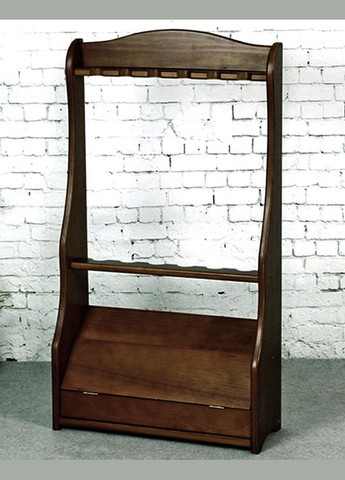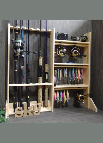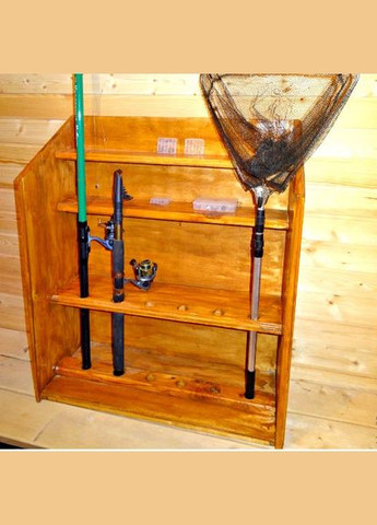 Розміри зовнішні: ширина - 75см, висота - 90см, глибина - 25см. Кількість місць під вудки 6шт. Покриття: акриловий лак.