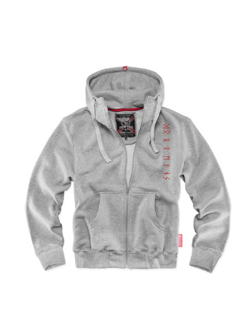Чоловіча толстовка на блискавці з капюшоном і двома кишенями. Модель з 100% бавовни щільністю 320 г. Має високий комір. Низ і рукава толстовки оброблені трикотажною резинкою, у капюшона зав'язки, металева фурнітура і вставка. У центрі вироби - велика кольорова етикетка та червона окантовка. Спереду горизонтальний принт по лівому шву. Використовувалися рунічні символи. Спина прикрашена великою двокольорового графікою з фігуркою вікінга, який тримає сокиру. На висоті лопаток напис з назвою колекції, що проходить по швах рукавів. Видно ефект розтріскування принта. Дизайн одягу Dobermans Aggressive - ось що є відмінною рисою бренду. Уважність до дрібниць, обробка, принти і вишивки - все це робить одяг Dobermans Aggressive не схожою на іншу.