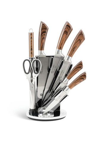 Набір ножів Edenberg Набір ножів Edenberg створений за найсучаснішими та наймоднішими технологіями та тенденціями. Набір кухонних ножів стане прикрасою на Вашій кухні та додасть неповторності Вашому інтер'єру. Характеристики: Тип: набір кухонних ножів Матеріал: нержавіюча сталь Матеріал ручки: бакеліт Матеріал підставки: пластик Кількість предметів: 8 Підходить для миття в посудомийній машині Виробник: Edenberg Комплектація: Поварський ніж 20 см Ніж для хліба 20 см Універсальний ніж12 см Ніж для овочів см Точило для ножів 19 см Кухонні ножиці Сокирка17 см Підставка 36 см