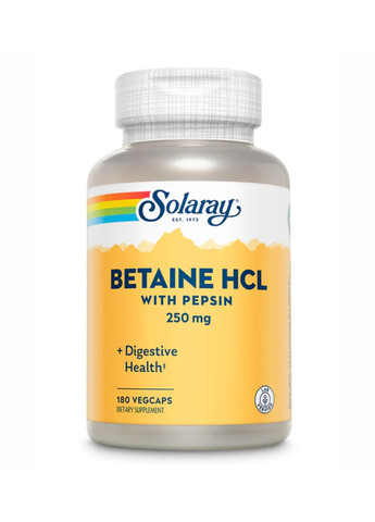 Бетаїн HCL з пепсином Необхідні для здорового травлення соляна кислота (HCl) і пепсин природним чином виробляються в шлунку та допомагають організму отримувати та розщеплювати поживні речовини з продуктів, які ми їмо. На жаль, з віком вироблення HCL в організмі зменшується, що може призвести до поганої функції травлення та засвоєння поживних речовин. Solaray Betaine HCL з пепсином забезпечує 250 мг бетаїну HCL, який може сприяти здоровому виробленню соляної кислоти, тоді як пепсин, ключовий травний фермент, може допомогти організму розщеплювати білки, амінокислоти та вітаміни та підтримувати нормальне травлення та комфорт шлунка. Ми також додали 100 мг листя папайї для додаткової підтримки здоров'я кишечника. Чудові інгредієнти Бетаїн HCL Глутамінова кислота HCL Пепсин Лист папайї (Carica papaya) Інші інгредієнти : мальтодекстрин, капсула рослинної целюлози та стеарат магнію.