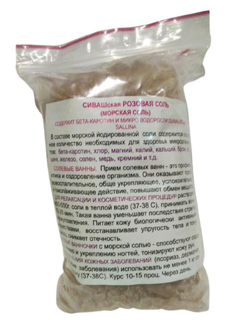 Продукт одержують шляхом природного випаровування солоної рапи. Він містить безліч корисних мінералів, органічних елементів, вітамінів, зокрема бета-каротин. Сіль використовують для загальнозміцнювальних та тонізуючих ванн, а також для низки косметологічних та лікувальних процедур. Сіль протестована дерматологами, підходить для людей, схильних до алергії. Сіль з унікального озера Сиваш має сильну антисептичну дію, стимулюють кровообіг і зменшують болючі симптоми. Подаруйте собі повноцінні процедури SPA у вас вдома. Натуральну сіль рекомендують використовувати у таких випадках: • інгаляції для лікування та профілактики дихальних захворювань; • полоскання порожнини рота при застудних та стоматологічних захворюваннях; • промивання носової порожнини при ринітах та гайморитах; • ванни для лікування хвороб шкіри; • ванни та компреси для лікування суглобів та мязів; • косметологічні ванни для зміцнення ламких і нігтів, що шаруються; • сольовий пілінг для зміцнення та стимуляції росту волосся; • ванни для лікування ожиріння та боротьби з целюлітом. Склад: насичені сольові сполуки з мінералами бром, натрій, магній, калій, йод. Протипоказання: Тромбофлебіт, хронічна ниркова недостатність. Інгаляції із сіллю Сиваша для лікування застуди, ангіни, кашлю, захворювань бронхів. 2 столові ложки солі Сиваша розчинити у 1 літрі води. Нагріти до 600С. Дихати таким розчином краще, сховавшись рушником 10 - 15 хвилин. Сіль для полоскання. 2 столові ложки солі Сиваша розчинити у 0,5 л. гарячої води. Остудити. Полоскати горло. При цьому треба памятати, що після полоскання не можна їсти і пити протягом півгодини. Сіль для промивання носа. 1 столову ложку солі Сиваша розчинити у склянці гарячої води. Відсудити. Промивати ніс або спеціальним пристроєм (можна купити в аптеці) або просто втягуючи розчин солоної води через долоні. Сольові ванни для схуднення, при болях у суглобах, мязах, при порушеннях обміну речовин та радикулітах та для підвищення тонусу всього організму. Побалуйте себе ваннами із сіллю Сиваша. Це найпростіший і найдоступніший спосіб оздоровитися та скинути зайві кілограми. Ванну приймайте зручною для себе температури, близько 37°С. Найкраще таку процедуру робити на ніч. Почніть з пропорції солі 200-300 г на ванну і поступово збільшуйте її до 2 кг. Зазвичай приймають 10-15 ванн, через день, по 10-15 хвилин кожна. Сіль для зміцнення нігтів. 1 столову ложку розчинити у склянці теплої води, потримати руки у такому розчині 10 хвилин. Слідкуйте, щоб нігті були занурені у воду. Після процедури руки промокнути рушником. Курс лікування 2 тижні, процедури за день. "Сольовий пілінг" для волосся - дуже простий засіб для очищення шкіри голови. Вологий ватний тампон обмочити у солі. Протягом 10 хвилин акуратно масажувати шкіру голови. Такий сольовий пілінг очищає шкіру голови від рогових лусочок, нормалізує діяльність сальних залоз, покращує кровообіг і сприяє постачанню киснем та поживними речовинами волосся та шкіри голови. Дуже корисно робити його перед будь-якими масками для голови, щоб підготувати шкіру та посилити їхню дію.