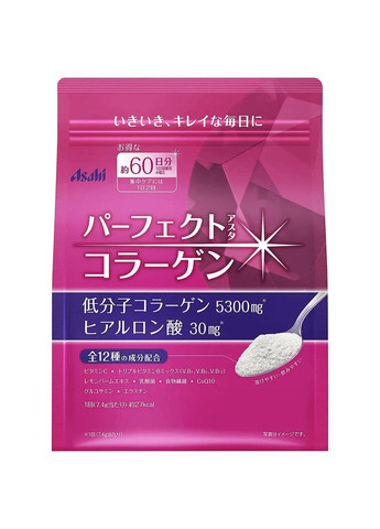 Опис Комплекс на основі низькомолекулярного колагену та 12-ти активних компонентів краси дозволить покращити загальний стан та пружність шкіри, зволожити її зсередини, позитивно вплине на гнучкість та здоров’я суглобів і зв’язок, зміцнить імунітет. Низькомолекулярний колаген тваринного походження у складі вважається багатим джерелом амінокислот, є корисним для живлення сполучної тканини, а також для здоров’я суглобів і хрящів. Крім того, здатен омолоджувати шкіру, зміцнювати волосся та нігті. Вживання колагену після 25 років є особливо важливим, адже тіло людини починає знижувати темпи його самостійного синтезу. Важливою перевагою цього комплексу є присутність у складі 12 активних компонентів, здатних підтримувати здоров’я та молодість організму: низькомолекулярний колаген тваринного походження, гіалуронова кислота, клітковина, вітамін С, коензим Q10, глюкозамін, еластин, лактобактерії, екстракти трав та ягід. Низькомолекулярний колаген — це колаген, що характеризується високим ступенем засвоюваності організмом, завдяки чому здатен ефективно і швидко демонструвати всі позитивні властивості колагену. Гіалуронова кислота — речовина, яка перешкоджає втраті вологи організмом. Здатна зволожувати і робити більш еластичною шкіру, сприяє розгладженню зморшок і рубців, відновлює хрящі та синовіальну рідину. Вітаміни групи В сприяють зростанню клітин, покращують стан дерми та волосся, здатні здійснювати значний вплив на обмін речовин в організмі. Вітамін С — важливий для організму людини антиоксидант, який відповідає за ріст і відновлення м’язів, кровоносних судин, ясен і зубів, впливає на стан кісток і хрящів, прискорює загоєння ран, зміцнює імунну систему. Коензим Q10 — унікальний мікроелемент, який підтримує пружність шкіри, наповнює клітини організму енергією, забезпечує оптимальний рівень зволоженості, стимулює вироблення колагену. Глюкозамін сприяє відновленню суглобів, хрящів і зв’язок. Еластин — білок, який дозволяє тканинам тіла відновлювати свою форму після розтягування і стиснення, а також відповідає за механічну міцність тканин. Лактобактерії допомагають підтримувати здоров’я кишечника, сприяють травленню, забезпечують правильне функціонування імунної системи, беруть участь у формуванні захисного бар’єру від шкідливих бактерій. Екстракти рослин у складі покликані покращити стан шкіри, зволожити її, стимулювати ріст волосся, вирівняти колір обличчя, підтримувати стан серцево-судинної системи. Не є лікарським препаратом. Виробник: Asahi Food and Healthcare Co., Ltd., JAPAN. Спосіб застосування 7 гр колагену розчинити у будь-якому безбілковому напої та випити. Вміст упаковки розрахований на вживання протягом 60 днів. Рекомендується приймати особам старше 25 років. Склад Porcine collagen peptide (including gelatin) (manufactured in Japan), dextrin, indigestible dextrin, lemon balm extract powder, sterilized lactic acid bacteria powder, edible oil, rose extract powder, coenzyme Q10, pig elastin peptide, VC, hyaluronic acid, emulsifier, glucosamine (derived from shrimp and crab), flavoring, V.B1, V.B6, sweetener (acesulfame K, sucralose), V.B12. Енергетична цінність (калорійність) на 7,4 г: 113 кДж / 27 ккал. Поживна (харчова) цінність на 7,4 г : білки — 5,5 г; жири — 0,22 г; вуглеводи — 1,5 г, з них цукри — 0,87 г; харчові волокна — 0,63 г; сольовий еквівалент — 0,0003-0,3 г. Інгредієнти на 7,4 г: колаген — 5300 мг, порошок екстракту меліси — 100 мг, гіалуронова кислота — 30 мг, вітамін В1 — 0,6 мг, вітамін В6 — 0,5 мг, вітамін