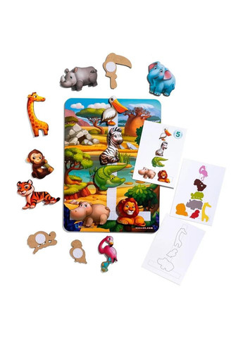 У наборі 6 картинок тварин, які розділені навпіл. Необхідно знайти свою половинку або ж пофантазувати і створити не "зебру", а, наприклад, "кото-зебру". Порахуйте тварин та розкажіть дитині, де вони живуть, що їдять і які звуки властиві саме їм. Деталі легко діставати пальчиками. 1. Розвиток логічного і понятійного мислення 2. За допомогою такого методичного матеріалу, діти пізнають навколишній світ. 3. Розвивається дрібна моторика. Вставляючи певним чином детальки, чудово тренуються пальчики. 4. Працює зорова пам'ять, тренується увагу і посидючість.