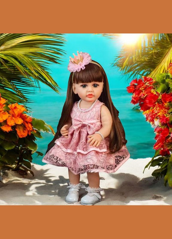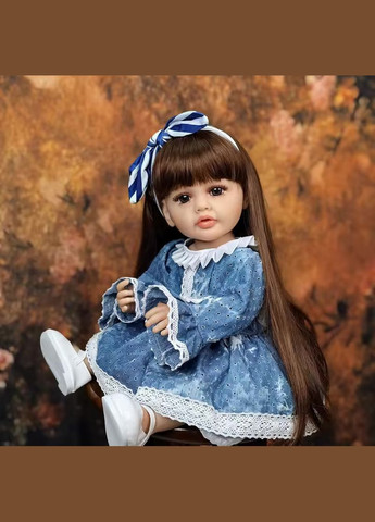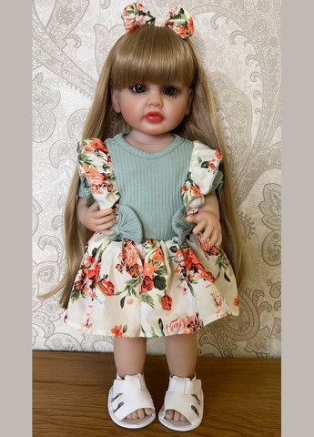 Матеріал: високоякісний силіконовий вініл. Голова, ручки, ніжки – також із силіконового вінілового матеріалу (легко миється ). Волосся ляльки – проклеєна перука з канекалону. Дуже приємне на дотик, максимально наближене до справжнього волосся. Завдяки цьому ляльку можна акуратно розчісувати й створювати різні зачіски Очі ляльки – високоякісні акрилові, прикрашені пухнастими проклеєними віями. Бровки промальовані з великою увагою до деталей. Носик має відкриті ніздрі, а губки виглядають дуже реалістично! Шкіра ляльки має природний матовий колір, що надає їй особливої натуральності. Лялька Reborn Baby Doll ручної роботи може сидіти, лежати та стояти, а також у неї рухаються ручки та ніжки. У комплекті (крім одягу, який носить лялька): пляшечка магнітна соска підгузки свідоцтво про народження Розмір ляльки: 55 см. Вага: близько 1,5 кг (після пакування – приблизно 1,8 кг). Розмір упаковки: 55×16×16 см.