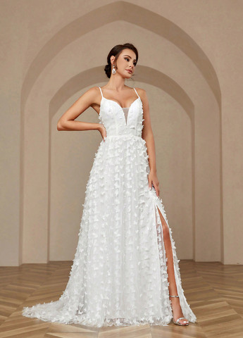 Романтична біла весільна сукня з V-подібним вирізом і мереживним візерунком у вигляді метелика. Має виріз-бретельку, високий розріз та великий низ. Має застібку-блискавку без спинки та стандартну посадку. Дизайн бретелей-спагетті забезпечує комфорт та стиль. Нееластична тканина для шикарного відчуття.