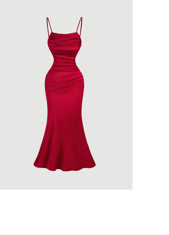 Елегантна сукня зі складаннями на бретельках-спагетті. Це сукня з відкритою спиною і подолом у формі русалки. Воно застібається на блискавку і має еластичну тканину. Виріз горловини - бретельки-спагетті.