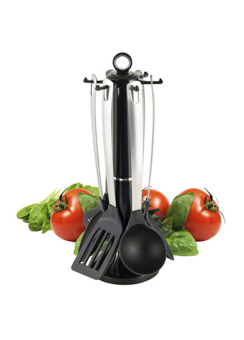 Це відмінний набір приладів, які щодня потрібні вам на кухні. У даному наборі ви знайдете: ополоник, ложку, картопляну м'яку, ложку для спагетті, вилку, лопатку. Ви зможете закріпити прилади на настінній вішалці або на підставці. Цей комплект дуже зручний у використанні, адже ручки не нагріваються. Характеристики: Матеріал корпусу: нержавіюча сталь 18/10 Кількість предметів: 7 Підставка Вилка для готування Картоплям'ялка (товкушка) Лопатка Ополоник (кухар) Ложка кулінарна Вінчик