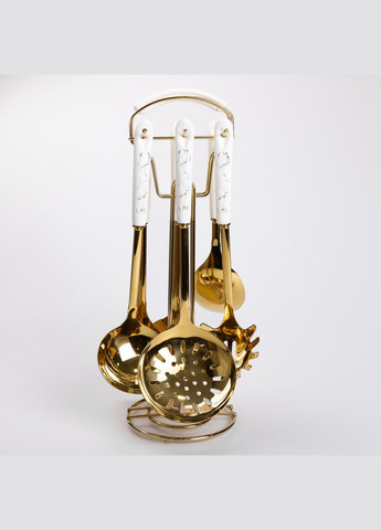 Набір кухонного приладдя складається з 6 предметів, виготовлених із нержавіючої сталі із золотою основою. Кожен елемент оснащений керамічними ручками, які забезпечують зручне використання та додають естетичності. Прилади розміщуються на металевій підставці, що сприяє компактному зберіганню та організації простору на кухні. До комплекту входять різні типи кухонного приладдя, призначені для зручного приготування страв. Лопатки, шумівки, половник і велика ложка мають оптимальні розміри та ергономічну форму для комфортного використання. Завдяки нержавіючій сталі прилади стійкі до корозії, не вбирають запахи та легко очищуються. Металева підставка забезпечує порядок і зручний доступ до кухонного приладдя. Керамічні ручки залишаються холодними навіть при контакті з гарячими поверхнями, що підвищує безпеку під час використання. Завдяки поєднанню якісних матеріалів і стильного дизайну набір підходить як для домашнього використання, так і для професійних кухонь. Характеристики: Матеріал: нержавіюча сталь, кераміка Кількість предметів: 6 Металева підставка для зберігання Вага: 1.5 кг Розміри: Лопатка – 34 см Лопатка з проріззю – 35 см Шумівка – 34,5 см Половник – 31,5 см Шумівка для спагеті – 30,5 см Велика ложка – 26,5 см