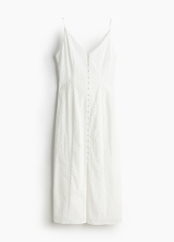Облягаюча бавовняна сукня довжиною до литок з англійською вишивкою. Бретелі-спагеті протягуються через невеликі петлі та зав'язуються ззаду. Сукня має V-подібний виріз, приховані ґудзики спереду та приховану блискавку збоку. Фігурні шви спереду та ззаду створюють привабливий силует. Підкладка з бавовняної вуалі.