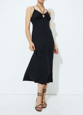 Сукня довжиною до ікри з віскозної тканини з кроєм, що облягає. Сукня без спинки і має регульовані бретельки-спагетті, що зав'язуються ззаду. Виріз-крапля спереду з декоративною куліскою та вузькими зав'язками, які зав'язуються на шиї ззаду. Без підкладки.
