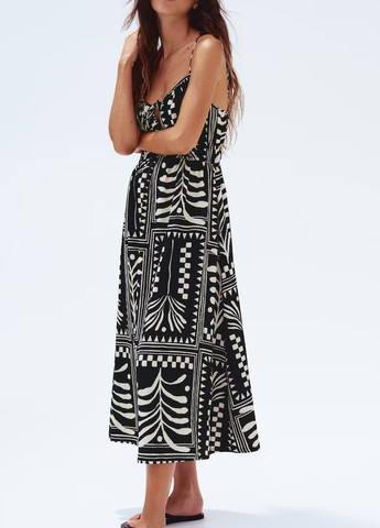 Сукня довжиною до литок з набивної бавовни з бретельками-спагетті, що регулюються, і облягаючим ліфом з вузькими зав'язками, що перехрещуються на спині. Вузька резинка на талії ззаду та складання спереду для ефекту драпірування. Верх на підкладці.