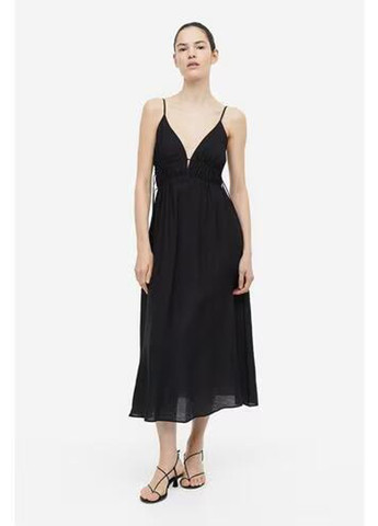 Сукня без рукавів довжиною до ікри з повітряної тканини з регульованими бретельками-спагетті та V-подібним вирізом спереду та ззаду. Потайна блискавка і застібка на гачок з одного боку, прибитий шов на талії та злегка розкльошена спідниця. Підкладка. Можливе пошкодження бірки