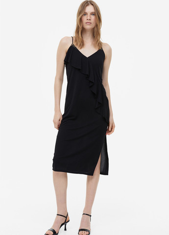 Сукня міді з м'якого трикотажу з V-подібним вирізом горловини та регульованими бретелями-спагеті. Широкий діагональний волан спереду та розріз з одного боку подолу.