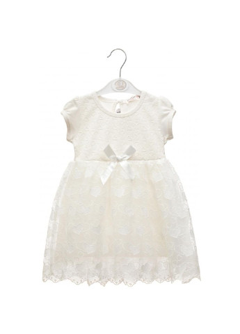 Дуже ніжна сукня з мереживною спідницею в сердечки. Дуже мила, ошатна сукня кремового кольору для маленької принцеси! коротким рукавчиком, красиво призібраним по окату. Лінія талії трохи завищена, на стику зі спідницею пришитий невеликий атласний бантик. Спереду ліф сукні подвійний: знизу - бавовняний трикотаж, верхній шар – якісно вишита маленькими серцями мереживне полотно в основі тону. Овальна горловина окантована еластичною трикотажною бейкою. На спинці сукні є гарний виріз у формі крапельки, який застібається на перламутрову ґудзичок. - красива мереживна спідниця, вишита сердечками різного розміру. Лінія з'єднання верху сукні зі спідницею добре тягнеться, завдяки пришитій тонкій резиночці.