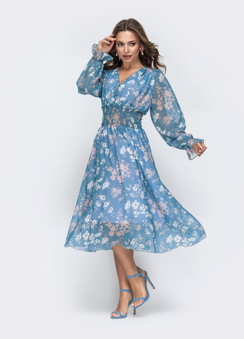 Вільна триярусна спідниця вгорі на чотирьох тонких резиночках, що дає ідеальну посадку по фігурі та повну свободу руху! Горловина, бретелі та пройми рукавів оздоблені м'якою резиночкою, це забезпечує прилягання до тіла і приховує білизну. Спереду поличка прикрашена ніжними рюшами з цієї ж тканини і трьома ґудзиками з натурального перламутру.