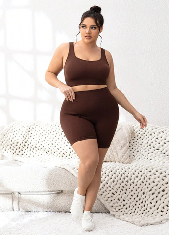 Кавово-коричневі шорти великого розміру та безшовний топ у тон призначені для спортивного образу.