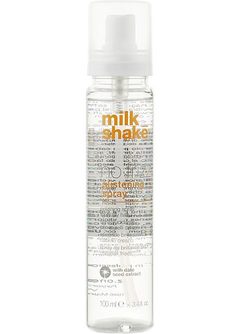 Якщо ви належите до щасливиць, які від природи мають в’юнкі кучері, але мрієте про прямі й гладенькі локони, спрей-блиск Milk_Shake No Frizz був створений спеціально для вас! Він зафіксує вирівняне волосся, щоб воно протягом усього дня тішило вас шовковистою гладкістю і сяйвом. Екстракт фінікових кісточок, багатий незамінними жирними кислотами, білками і полісахаридами, відновлює структуру сухих і пошкоджених локонів, а олія крамбе надає глибокий зволожувальний ефект. Зручний формат спрею гідно оцінять дівчата, які живуть у напруженому міському ритмі і не мають у своєму розпорядженні великої кількістю часу для спеціальних доглядових процедур. Особливості Milk_Shake No Frizz Glistening Spray: - випрямляє кучеряве і в’юнке волосся;- зволожує і пом'якшує;- попереджає виникнення «ефекту кульбаби»;- додає гладкості та блиску;- перешкоджає сплутуванню;- знімає статичну електрику;- захищає волосся від негативних факторів навколишнього середовища;- не жирний і не склеює пасма;- активні компоненти: екстракт плодів пальмового дерева, масло абісинської гірчиці, інноваційний коктейль з летючих силіконів.