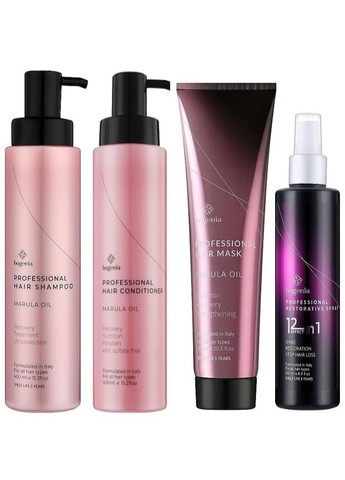 Професійний набір для волосся з олією марули Professional Hair Marula Oil: 1. шампунь 400 мл 2. кондиціонер 400 мл 3. маска 300 мл 4. відновлюючий спрей 12 в 1, 250 мл Професійний набір для волосся з олією марули: шампунь + кондиціонер + маска + спрей 12 в 1 + олійка Bogenia Professional Hair Marula Oil — це ідеальне рішення для тих, хто прагне надати своєму волоссю повний спектр догляду, поєднуючи ефективність і розкіш у кожному етапі. Цей набір створений, щоб забезпечити ваше волосся всім необхідним для здоров'я, краси та сили, починаючи від очищення і завершуючи інтенсивним живленням та захистом. Шампунь з олією марули м'яко очищає волосся і шкіру голови, зберігаючи їх природний баланс. Він дбайливо видаляє забруднення, роблячи волосся свіжим і підготовленим до наступних етапів догляду. Кондиціонер з олією марули забезпечує глибоке зволоження і розгладжує волосся, полегшуючи розчісування і укладання. Він надає волоссю шовковистість, блиск і захищає його від ламкості та пошкоджень. Маска з олією марули — це справжній ритуал відновлення. Вона проникає вглиб волосся, живить його зсередини, повертаючи йому здоров'я, еластичність і природний блиск. Маска відновлює структуру волосся, роблячи його сильним і стійким до зовнішніх впливів. Відновлюючий спрей 12 в 1 з олією марули — це багатофункціональний засіб, який надає волоссю 12 корисних властивостей. Він одночасно відновлює, зволожує, захищає від термічного впливу, додає блиск і полегшує укладання. Спрей миттєво покращує стан волосся, роблячи його гладеньким, м'яким і сяючим. Цей набір — справжній еліксир краси, який перетворює ваше волосся на джерело впевненості і привабливості. Bogenia Professional Hair Marula Oil дарує вашому волоссю найкращий догляд, забезпечуючи його здоров'я, блиск і доглянутий вигляд щодня. Відкрийте для себе силу олії марули і насолоджуйтеся бездоганним результатом з кожним використанням.