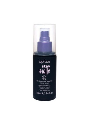 Фіксуючий спрей для макіяжу topface Stay Matte матуючий мінімізуючий пори Спрей Stay Matte Fixing Spray створює невидимий та легкий захисний шар на шкірі, забезпечуючи стійкість макіяжу протягом усього дня. Завдяки спеціальній формулі з мінеральним комплексом б'юті-продукт не лише фіксує тональний крем та іншу косметику, а й допомагає освіжити та зволожити шкіру. Фіксатор для макіяжу Stay Matte: забезпечує матовість і бархатистість шкіри; видаляє жирний блиск; мінімізує пори, роблячи шкіру надзвичайно гладкою. Переваги фіксатора-спрею для макіяжу topface Stay Matte: згладжує розширені пори; дарує жирній шкірі розкішний матовий фініш; робить ваш макіяж стійким від ранку до вечора; освіжає та зволожує шкірний покрив. Забудьте про жирний блиск та розширені пори – подаруйте собі спрей Stay Matte Fixing Spray від Topface для ідеального матового макіяжу протягом усього дня! Спосіб застосування: Перед використанням добре струсіть флакон. Нанесіть на обличчя макіяж. Розпиліть спрей на обличчя з відстані 20-25 см. Уникайте потрапляння засобу у вічі. Дайте фіксатору макіяжу висохнути природним шляхом. Об'єм: 100 мл