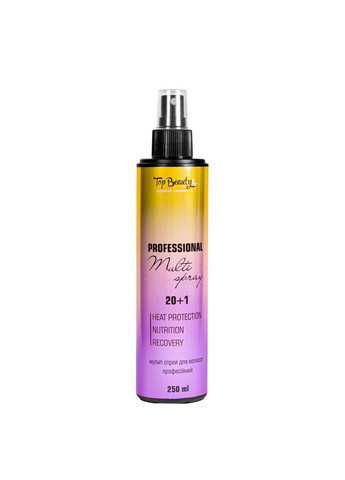 Професійний спрей для волосся Top Beauty 20+1 з ефектом термозахисту, живлення та відновлення 250 мл Мультифункціональний спрей-догляд для волосся Top Beauty 20+1 Heat Protection Nutrition Recovery володіє 21 властивістю, яка допомагає зробити ваше волосся міцним, здоровим, сяйнистим. Зокрема, цей засіб для догляду за волоссям: захищає локони від шкоди високих температур; зволожує; забезпечує еластичність; відновлює пошкоджену структуру волосся; перешкоджає виникненню посічених кінчиків під час укладання волосся; має природну фіксацію; допомагає зберегти яскравість відтінку фарбованого волосся; захищає ваші локони від ультрафіолету. Спрей-термозащита містить натуральні олії жожоба, аргани, кокосу, екстракти розмарину, ромашки, які ретельно доглядають за вашим волоссям і роблять його сильним, блискучим, насиченим і зволоженим по всій довжині. Спрей має густу маску текстуру. Завдяки їй та дозатору у вигляді бризкалки засіб економно витрачається. Спробуйте цей спрей, і будьте впевнені, що ваше волосся в повному порядку, навіть якщо вам доводиться користуватися прасками для укладання і часто бувати під сонячним промінням. Спосіб застосування Нанесіть спрей-кондиціонер на волосся після миття голови. Висушіть волосся феном або дайте йому висохнути природним шляхом.
