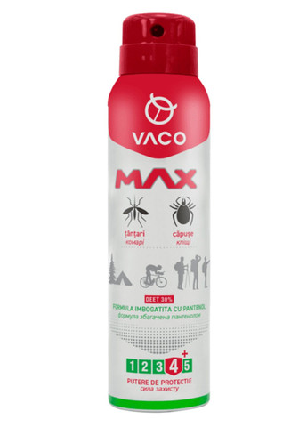 Інноваційний аерозоль, призначений для відлякування докучливих комарів, кліщів і мошок MAX від VACO, є продуктом, який користується відмінною репутацією серед сучасних споживачів. Спрей дуже зручний у нанесенні завдяки закриттю типу ON/OFF і забезпечує максимальний ефект у вигляді ефективного захисту від комах до 8 годин. Його додатковою перевагою є приємний аромат з квітковим ароматом. Містить DEET 30% і евкаліптову олію, які одночасно захищають від укусів і створюють захисний барєр від комах там, де це потрібно. Також варто згадати про пантенол, що міститься в складі, який володіє заспокійливими і регенеруючими властивостями. Засіб слід наносити безпосередньо на шкіру та зберігати в недоступному для дітей місці.