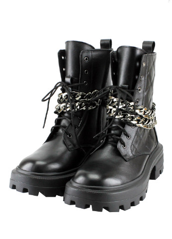 Стильні та зручні черевики виконані з натуральної шкіри з ефектом стьобаною. Модель застібається за допомогою блискавки та шнурівки. Черевики прикрашені ланцюгами срібного кольору. Висота підошви по п'яті - 6 см, по шкарпетці - 3,5 см. Модель повномірна.
