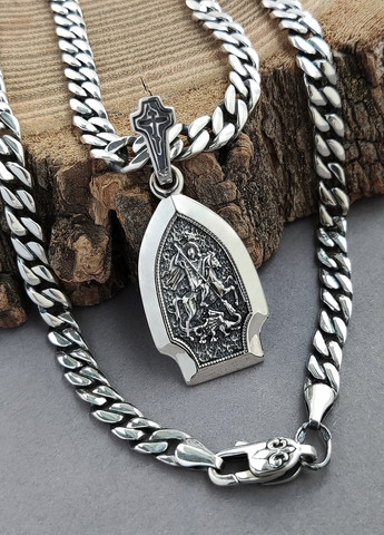 Срібний комплект "Георгій Змієборець" - це потужний символ перемоги добра над злом, віри, мужності й духовного захисту. Кулон з образом Святого Георгія, що перемагає змія, нагадує, що справедливість та сила духу завжди долають темряву. Виконаний зі срібла високої 925 проби, комплект вражає чітким рельєфом, глибокою деталізацією та поєднанням матової та полірованої поверхні. Масивний ланцюжок плетіння “Панцир” підкреслює силу та впевненість свого власника. Його ретельно відшліфовані грані грають на світлі, створюючи благородне сяйво холодного срібла. Це прикраса для тих, хто шукає не просто аксесуар, а особистий оберіг — символ віри, мужності й захисту у будь-яких життєвих випробуваннях.