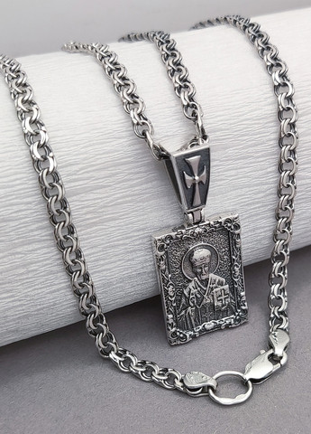 Срібний комплект ланцюжок та ладанка "Микола Чудотворець"— це поєднання віри, захисту та благородного стилю. Лаконічний ланцюжок гармонійно доповнює ладанку, на якій зображений образ святителя Миколая – покровителя мандрівників, заступника та помічника у важкі часи. Срібло надає виробу особливого сяйва, символізуючи чистоту думок та силу молитви. Цей комплект стане не лише витонченим аксесуаром, а й потужним оберегом, що дарує віру, спокій та невидиму підтримку в кожному дні. Розміри срібного ланцюжка 925 проби плетіння бісмарк - 50, 55 та 60 см. При розмірі 50 см середня вага - 9,2 грам, при розмірі 55 см - 10 грам, при розмірі 60 см середня вага - 11 грам. Ширина ланцюжка складає 4 мм. Вага ланцюжка може незначно відрізнятися залежно від партії. Середня вага ладанки - 7,5 грам срібла 925 проби. Розмір ладанки – 38х17 мм (разом з вушком).