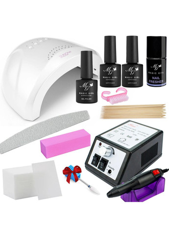 Ідеальне рішення для твого старту. Вигідна ціна - є безсумнівною перевагою набору. В ньому ти знайдеш все необхідне для своєї роботи. В набір входить: Лампа Sun One 48 Вт; Дана модель має кнопку для перемикання потужності та може працювати на 24 або 48 Вт. Кнопки розташовані зверху і мають світлодіодні індикатори, що дозволить зручно перемикати таймер на 5,30,60 секунд. Знімне дно на магнітах дозволить використати лампу для педикюру. Відмінно підійде як для полімеризації гель лаків, так і для UV-активних та LED-активних гелів. Фрезер ZS-603 65 Вт; Фрезер для манікюру Drill pro ZS 603 - 65W/35 000 об - ідеальне рішення для професійних манікюрних кабінетів та салонів краси. Особливості фрезера : функція самоохолодження; добротний корпус виготовлений із екологічно безпечного пластику, легко чиститься та миється; шнур не перегинається, не перекручується; комплектується високошвидкісними підшипниками; шумова вібрація мінімальна; високий крутящий момент; вбудований реверс, що дозволяє фрезі крутитися у різних напрямках. Magic Girl Base Rubber Strong База для гель лаку, 8 мл; Base Rubber Strong - еластичний базовий шар, який міцно зчіплює лак з поверхнею натурального нігтя, значно підвищуючи довговічність покриття. Запобігає відшаровуванню лаку, пожовтенню нігтів та появі плям на натуральних та штучних нігтях. База ідеально підійде як еластична підкладка гелю. Наноситься тонким шаром, забезпечує приголомшливе зчеплення і має ідеальну еластичність. Топ Magic Girl Diamond без липкого шару, 8мл; Фінішне покриття ( топ ) високого класу MG Diamond без липкого шару та УФ-фільтрів. Надає надстійкого блиску та яскравості гель-лаків. Забезпечує захист кольорового покриття від сколів, тріщин, подряпин, вигоряння кольору. Надає додаткової міцності гель-лаку. Створює ефект «під склом». Гель лак кольоровий Magic Girl - 3 шт (колір на вибір), 8мл; Високоякісний гель лак виготовлений з німецької сировини із широкою палітрою відтінків. Відмінна зносостійкість, зручна у нанесенні, самовирівнюється по нігтьовій пластині. PolyGel Полігель для нарощування Magic Girl (колір на вибір), 15мл; PolyGel від Magic Girl - є сукупністю матеріалів таких як акрил і гель, в результаті чого вийшов дуже міцний матеріал, призначений для зміцнення нігтьової пластини, нарощування та корекції нігтів. Праймер для нігтів Magic Girl, 15мл; Безкислотний праймер від Magic Girl - Це рідина, свого роду 2-х сторонній скотч, який залишає на нігтьовій пластині липкий шар, за рахунок якого гарантується зчеплення штучного матеріалу з натуральним. РН штучного покриття. Рекомендується наносити праймер на вільний край нігтьової пластини. Slip Solution засіб для роботи з полігелем Magic Girl 100мл; Рідина для роботи з полігелем Slip Solution від Magic Girl - дозволяє легко розподілити полігель / акрігель по поверхні нігтя. - не містить активаторів/мономерів; - не викликає роздратування. Засіб для знежирення 3 в 1 Magic Girl 100мл; Засіб для знежирення нігтів призначений для підготовки нігтьової пластини до нанесення штучного матеріалу. Він усуває забруднення, зайву вологу та жир, сприяє кращому зчепленню матеріалу з натуральним нігтем та допомагає зберегти манікюр, запобігаючи сколам та відшаровуванням покриття. Пилка для нігтів; Різна абразивність сторін пилки дозволяє використовувати її для штучних та натуральних нігтів. Сторона з абразивністю 100 грит призначена для жорсткого спилювання штучних матеріалів (ге