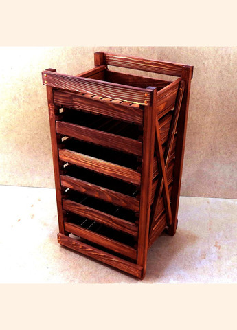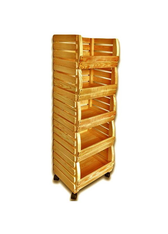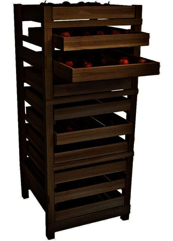 Дерев’яний стелаж для зберігання овочів і фруктів.