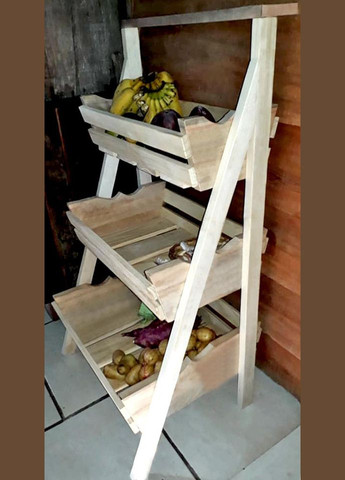 Дерев’яний стелаж для зберігання овочів і фруктів.