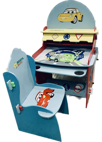 Стіл письмовий і стілець Тачки. Дитяча парта зі стільчиком Bambi «Тачки» W 026 Зручна барвиста дитяча парта. Дитяча парта призначена для дітей із 3 років до 8 років. Поверхня стільниці ламінована, її легко мити та чистити. Дитяча парта досить компактні та займають мало місця, що дає змогу використовувати їх навіть у малогабаритних приміщеннях. Виготовлено з високоякісних матеріалів, пофарбовано нетоксичними фарбами на водній основі. Висувна поличка з 2 стаканчиками для фломастерів. Зручна підставка для ніг. Додаткові полички для аксесуарів. стіл-парта (розміри: 56 х 96 х 42 см); стільчик (розміри: 26 х 26 х 36 см); Дитяча парта постачається в розібраному вигляді в картонному пакованні. Розміри упакування: 65 х 90х 46 см. Дитячі парти та стілець чудово підійдуть для дошкільної підготовки малюка, а також прив'яже у Вашої дитини розуміння робочого місця та кабінету. Призначені для серйозних розвивальних ігор та занять. Велика стільниця з полицею та стаканчиками для канцелярського приладдя привчать Ваше чадо до ладу та стане незамінною під час читання, писання, малювання, ліплення та прочем. Зручний стілець підтримує правильну поставу в дитини. Основна інформація щодо товару Загальна довжина — 560+400 мм. Загальна ширина — 910+320 мм. Загальна висота — 400+290 мм. Матеріал — дерево.