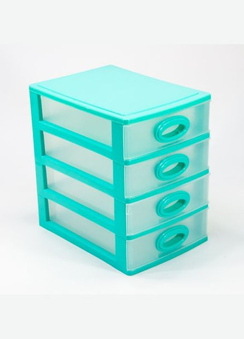 Мінікомод на 4 відділення. для зберігання дрібних виробів, біжутерії, канцелярії, дитячих речей тощо. Чотири шухляди однакового розміру 190х265мм Кілька мінікомодів можна поставити один на інший або комбінувати кількість ящиків, на свій розсуд, що дає змогу ефективно використовувати простір у стелажі або на письмовому столі. Комод легко розбирається й збирається без інструментів або спеціальних пристроїв Виготовлений із високоякісного пластику. Колір бірюзовий Висота 270 Ширина 190 Довжина: 270