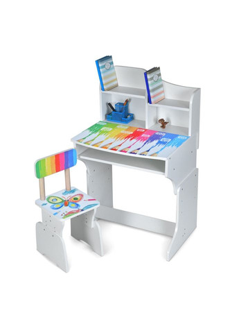 Evo-kids (стіл + стілець + полиця) — ультрасучасна новинка у світі дитячих меблів. Стіл цієї моделі завширшки 90 см має полицю-надбудову з двома поличками. На них можна розмістити книги, монітор комп'ютера або світлодіодну лампу. На надбудові кріпиться металева підставка для книги з регульованим кутом нахилу. Її легко можна сховати через непотрібність. Висота столу регулюється за допомогою шнекового механізму ручкою. Як ви, так і ваша дитина зможете легко відрегулювати стіл, а завдяки шкалі зросту, зображеній на ніжках, це буде зробити ще простіше. Ручку можна розмістити з будь-якого боку столу. Кут нахилу стільниці змінюється до 60 градусів за допомогою плавного газліфта. Для безпеки регулювання на стільниці передбачений проміжок, щоб дитина не прищемила пальці. Під стільницею розміщений висувний органайзер із міцного та безпечного ABS-пластику. У ньому можна зберігати канцелярію та шкільне приладдя. Знімний пластиковий бар'єр запобігає скочуванню предметів зі стільниці. На металевому гачку зручно розміщується портфель юного школяра. Унікальність комплекту полягає в стільчику, який регулюється і за висотою, і за глибиною, тому підійде для маленьких дітей від 3 років. Конструкція стільця стійка, виготовлена з металу, пофарбованого порошковою фарбою, безпечною для дітей. Сидіння і спинка стільця виготовлені з м'якого меблевого наповнювача, зверху обтягнутого повітропроникною меблевою тканиною, мають заокруглену форму, без гострих кутів. Висота змінюється поступово за допомогою металевих фіксаторів на ніжках. Для закріплення висоти використовуються гвинти. Глибина регулюється пластиковим гвинтом під сидінням. Ніжки обладнані регулювальними меблевими опорами. Максимальне навантаження на стільчик — 60 кг. Вага: 38.5 кг.