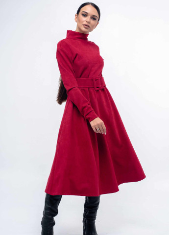 Оригінальна жіночна сукня напівприлеглого силуету міді довжини, з горловиною-стійкою і вільною спідницею, що розкльошує, в бічних швах якої є кишені. Довгий рукав зі спущеною лінією плеча закінчується манжетою. Ця зручна сукня чудово підкреслить Вашу жіночність. У комплект входить пояс із самобутньою пряжкою із основної тканини сукні.
