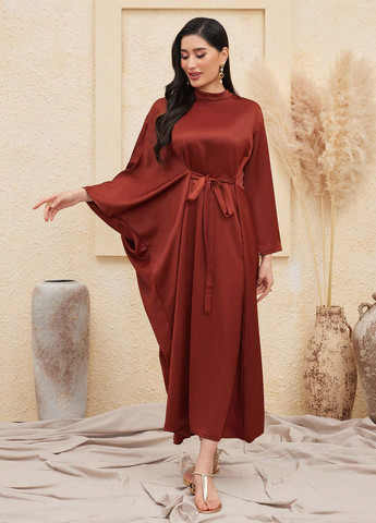 Елегантний каптан з довгими рукавами, коміром-стійкою та регульованою талією спереду. Має вільний крій, довгу довжину та рукави «кажан». Одяг виготовлений з нееластичної тканини, має простий дизайн, без ременів та гудзиків.
